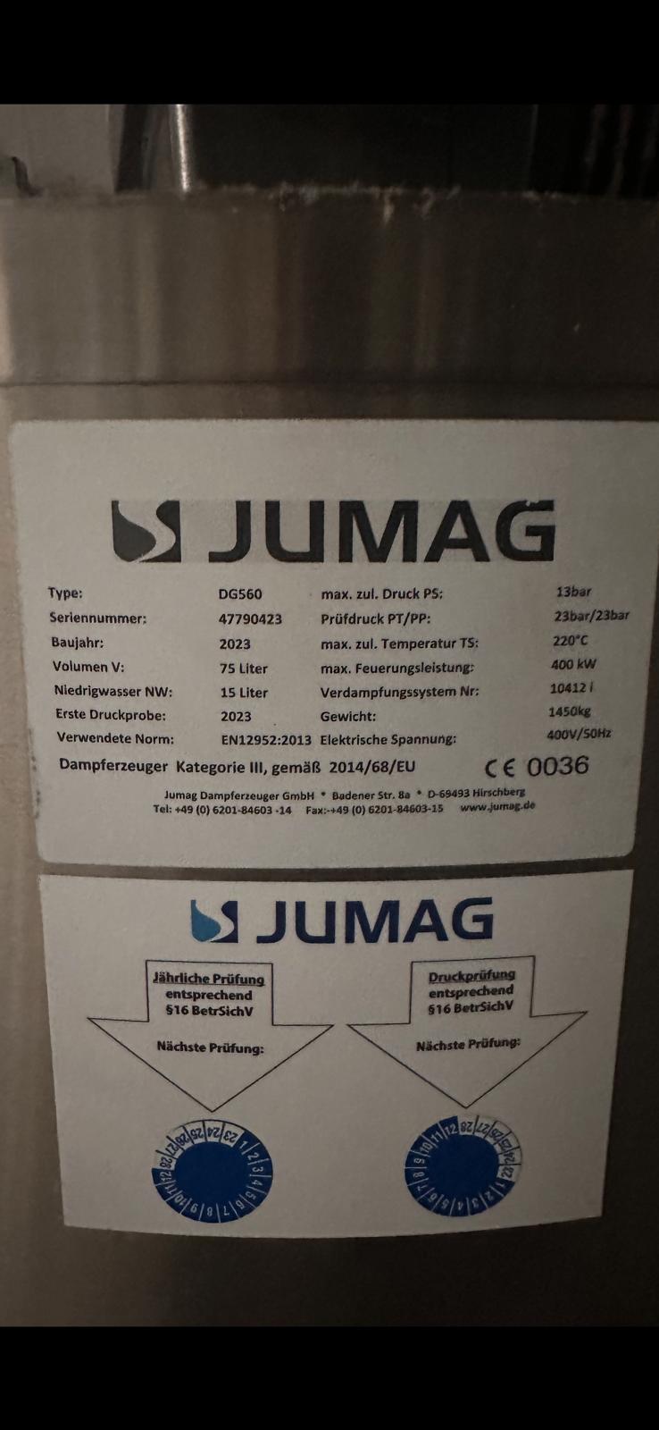 Zum Verkauf steht eine hochwertige JUMAG Tandem-Anlage (2 x DG560), bestehend aus zwei Dampfgeneratoren des Typs DG560, Baujahr 2023. Die Anlage verfügt über weniger als 3.000 Betriebsstunden und befindet sich aufgrund der kurzen Einsatzdauer in einem sehr guten Zustand. Neupreis der Anlage betrug 2023 insgesamt 169000 € / Netto.