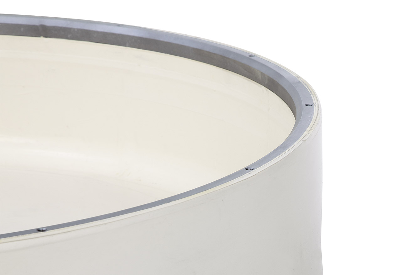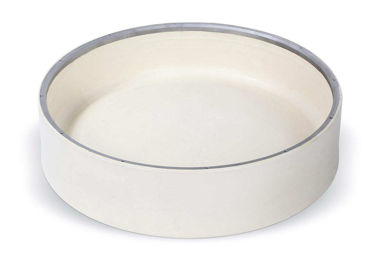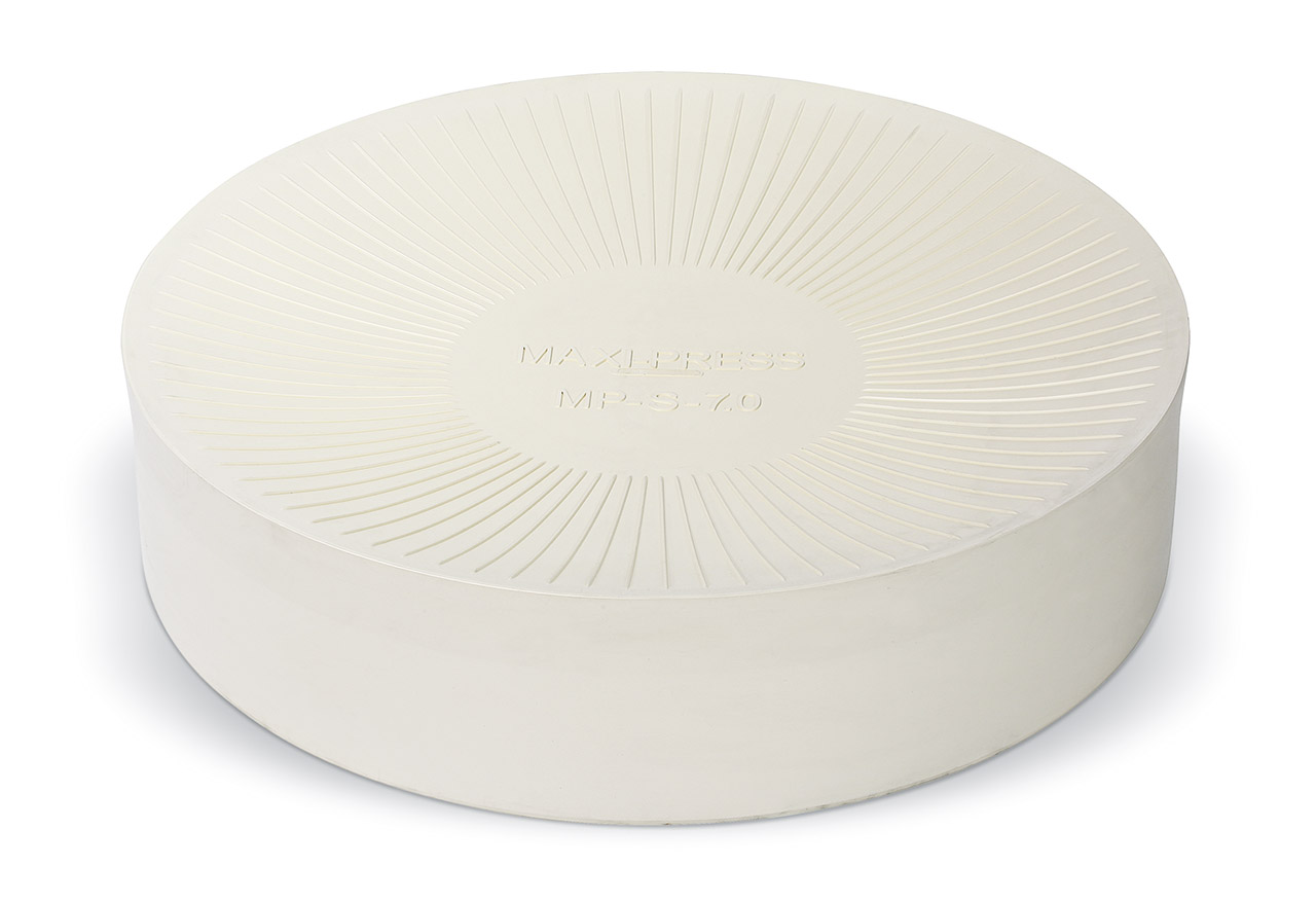 EASYFIX Membrane in weißem Naturkautschuk (NR) mit einvulkanisiertem Befestigungsring. Die Montage erfolgt ohne zusätzlichen Befestigungsring direkt an die Stempelplatte und spart so 80% der Montagezeit und die Kosten für die bei Standardmembranen benötigten Befestigungsringe.