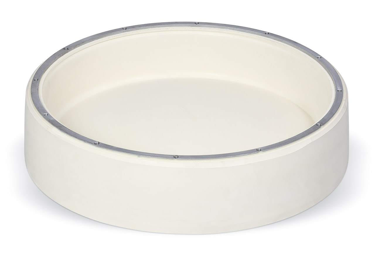 HIGH TEC Membrane in weißem, eigens entwickelten Naturkautschuk (NR) mit Ring aus Stahl und strahlenförmiger TOUCH Pressfläche. Die Membrane ist abriebfrei. Eine Verschmutzung der Wäsche wird somit vermieden. Die strahlenförmige TOUCH-Pressfläche minimiert das Verkleben der Wäsche an der Membrane.