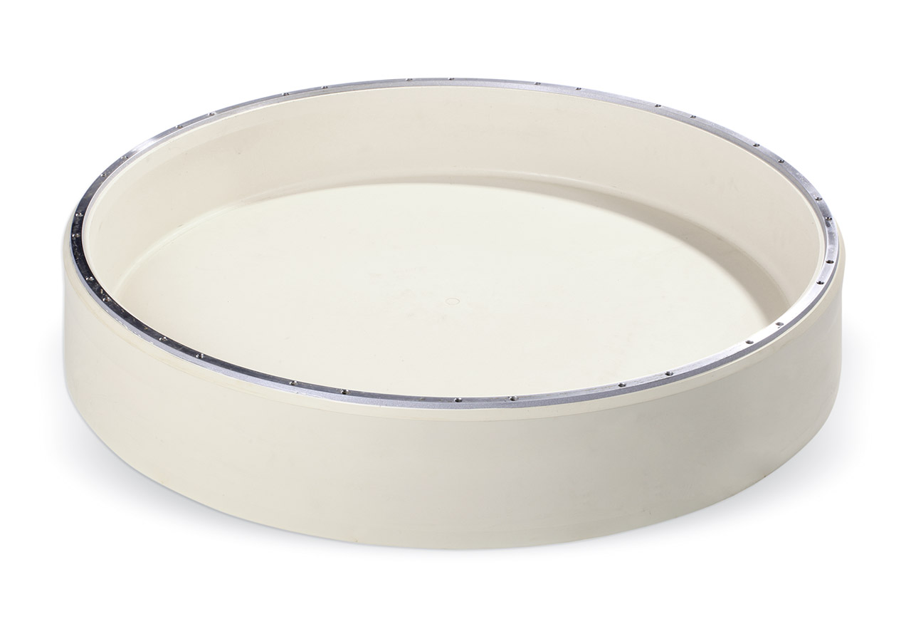 HIGH TEC Membrane in weißem, eigens entwickelten Naturkautschuk (NR) mit Ring aus Edelstahl und strahlenförmiger TOUCH Pressfläche. Die Membrane ist abriebfrei. Eine Verschmutzung der Wäsche wird somit vermieden. Die strahlenförmige TOUCH-Pressfläche minimiert das Verkleben der Wäsche an der Membrane.