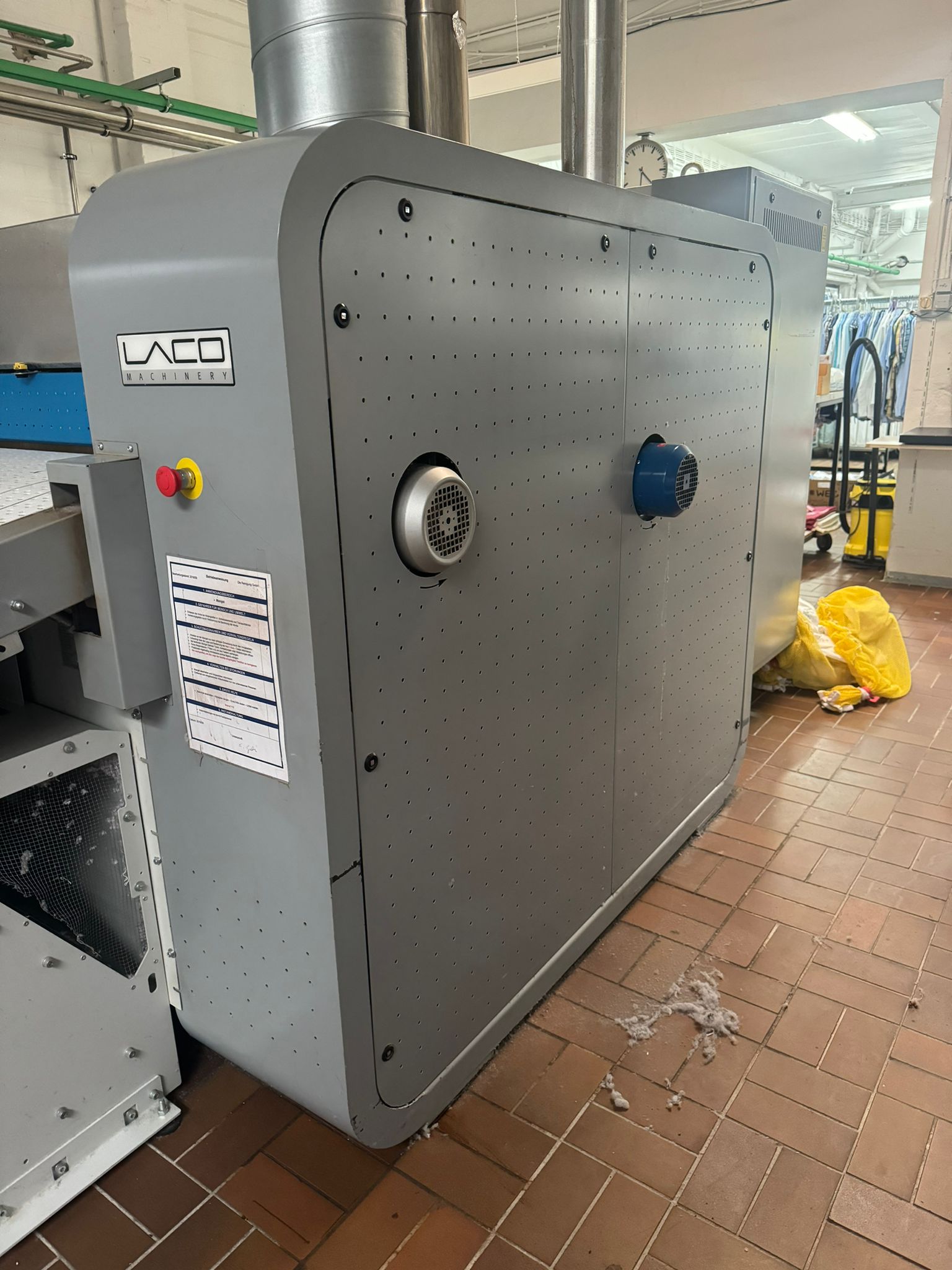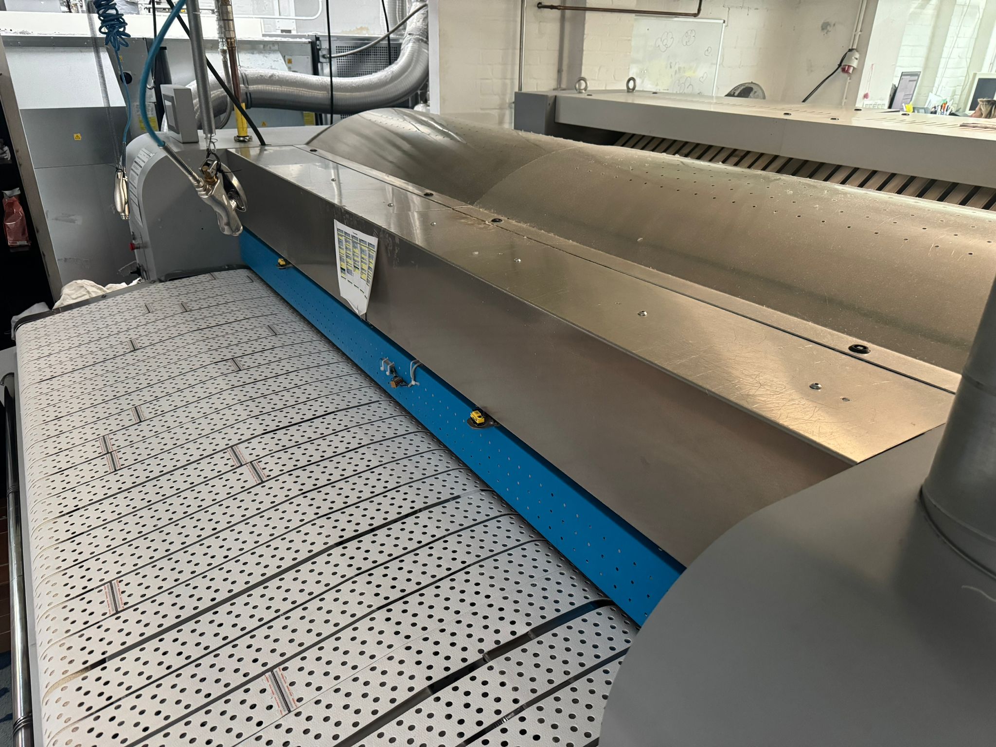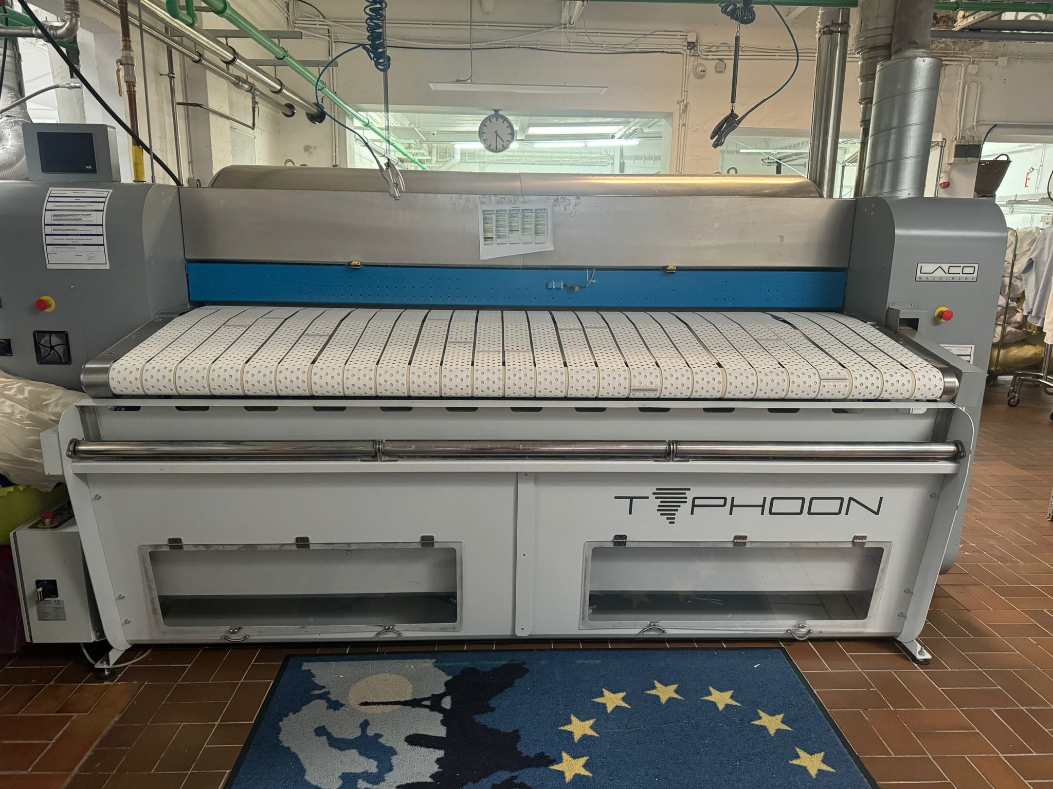 INDUSTRIE MULDENMANGEL D1200 Die Industriemangel ist bekannt für ihre Qualität und perfekte Verarbeitung.Das Modell D1200 ist eine 1-Rollen-Mangel mit einem Rollendurchmesser von 1200mm und einer gesamten Bügellänge von 1,94 Metern und einer Arbeitsbreite von 2,5 Meter. EXTRA GROSSE BÜGELFLÄCH Durch Wissen und Innovation haben wir die Bügelfläche um bis zu 15% vergrößert. Das gleiche Ergebnis kann bei vergleichbaren Maschinen nur mit größerem Rollendurchmesser erzielt werden. Der Vorteil ist, dass für mehr Leistung weniger Stellfläche benötigt wird und somit auch die Betriebskosten niedrig gehalten werden können. Beschreibung Produktionskapazität maximal 250 kg / h Extra große Bügelfläche 1,94 m, kleinere Stellfläche Flexible Stahl Mulde®, anpressdruck gesteuert durch Öldruck, verlängert die Lebensdauer der Walze Beheizung jeder Walze einstellbar – Lange beheizte Brücke Optimale Energierückgewinnung Farb-Touchscreen 7,5” Hydraulische Mulden-Druckregelung Gas Ergonomische Eingabehöhe Patentierte flexible Stahlmulde Einfach zu änderndes Band Service-Gangway Absaugung pro Walze inklusive Typhoon Eingabe Hilfe (Saugschacht) inklusive Faltmaschine Lacofold EVO 2(längst Faltmaschine, 1 Bahning oder 3 Bahning)