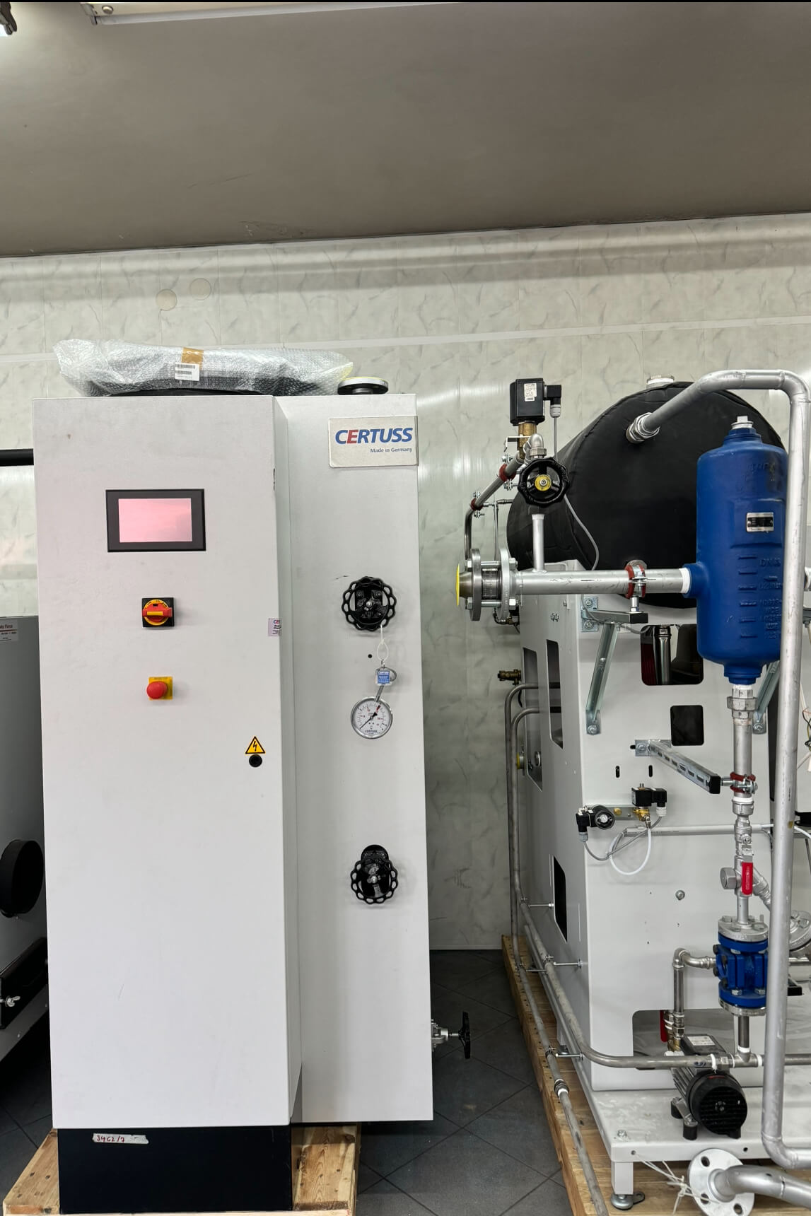 Gebrauchter Certuss Universal 600 TC gasbefeuerter Dampferzeuger (600 kg/h) mit Certuss CVE 600 TC Kompaktanlage / Versorgungseinheit Die Anlage wurde insgesamt ca. 5 Stunden betrieben und es wurden lediglich 9 m³ Wasser eingespeist. Zum Angebot gehört folgendes gebrauchtes Equipment: 1x Certuss Universal TC Gasbefeuerter Dampferzeuger, 600 kg/h, Baujahr: 2020 Min. / max. Betriebsdruck: 0,6 MPa (6 bar) / 0,8 – 3,0 MPa (8 – 30 bar) Max. zulässiger Überdruck: 1,0 – 3,2 MPa (10 – 32 bar) Heizleistung: 394 kW Nennleistung: 436 kW 1x Speisewassertank aus Edelstahl (isoliert) 1x Dampf-Einspritzheizsystem 1x Elektronischer Niveauregler für den Speisewassertank 1x Abschlammvorrichtung aus Edelstahl 1x Probenkühler aus Edelstahl 1x Druckerhöhungspumpe mit Steuerung 1x Dampfabcheider mit Kondensatableiter-Set 1x Wasserenthärter 1x Wasserzähler 1x Wasserfilter 1x Chemikaliendosierbehälter mit Pumpe CVE Kompaktmodul, Baujahr: 2020Automatische Start-/Stopp-/Abschlammfunktion